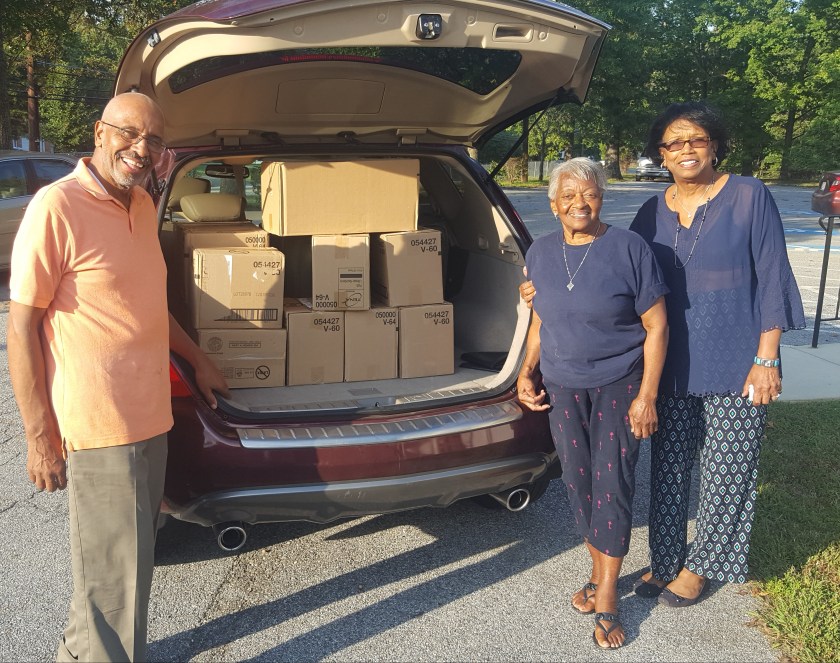 Next Image 20181003_171515 One of two car loads of donated items from Grace UMC. Pictured at Pastor Slade, Willette Warner and Iris Rogers